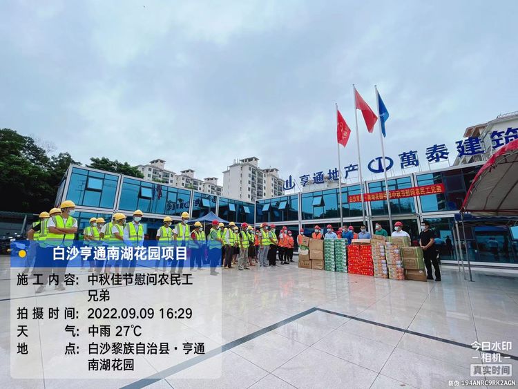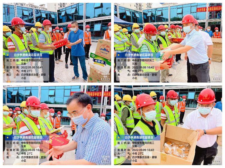 中秋慰問傳真情,濃濃關(guān)懷暖人心。為進(jìn)一步推動農(nóng)民工權(quán)益保障工作做深做實,慰問馳援三亞歸來的抗疫“英雄”和項目一線工人,提升萬泰大家庭的凝聚力、向心力,2022年9月9日,在中秋佳節(jié)來臨之際以及白沙縣工會的支持下,海南萬泰建筑工程有限公司聯(lián)合白沙亨通房地產(chǎn)開發(fā)有限公司在亨通·南湖花園項目部開展了慰問一線工人主題活動,為工友們送去中秋月餅、米油、消暑茶等慰問品。白沙亨通地產(chǎn)董事長周金華、項目總監(jiān)劉普、財務(wù)總監(jiān)何承中,萬泰公司工程部部長侯領(lǐng)、項目執(zhí)行經(jīng)理祁冀等人參加本次活動。