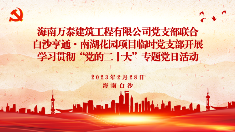 春暖花開,萬物可期。為學習貫徹落實黨的二十大會議精神,將黨建工作與業(yè)務(wù)工作有機結(jié)合,發(fā)揮基層黨組織戰(zhàn)斗堡壘的作用,在海南省質(zhì)安局的關(guān)心指導下,2023年2月28日,海南萬泰公司黨支部、工程部有關(guān)負責同志到項目部現(xiàn)場為白沙亨通·南湖花園項目黨建聯(lián)建共創(chuàng)基地舉行揭牌儀式,并聯(lián)合項目臨時黨支部開展了學習貫徹“黨的二十大”專題黨日活動,同時,對項目工地的塔吊等重型機械進行了安全檢查。