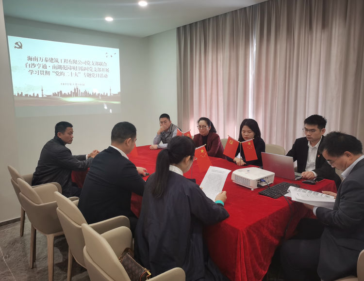 隨后,海南萬泰公司黨支部、亨通·南湖花園項目臨時黨支部集中組織學習了黨的二十大會議精神、海南省住房和城鄉(xiāng)建設(shè)工作會議精神以及建筑行業(yè)有關(guān)法律法規(guī)。項目臨時黨支部書記何承中表示,在今后的工作開展中,將繼續(xù)堅持黨建引領(lǐng)項目建設(shè),與項目部一同,不斷努力提升項目安全生產(chǎn)、文明施工、工程質(zhì)量水平,確保項目后續(xù)建設(shè)工作順利進行。