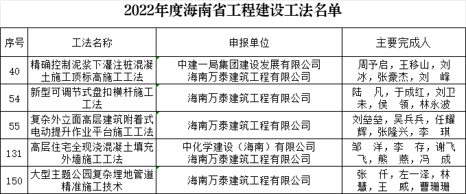 近日,由海南萬泰建筑工程有限公司申報(bào)的《大型主體公園復(fù)雜埋地管道精準(zhǔn)施工技術(shù)》《復(fù)雜外立面高層建筑附著式電動(dòng)提升作業(yè)平臺(tái)施工工法》《高層住宅全現(xiàn)澆混凝土填充外墻施工工法》《精確控制泥漿下灌注樁混凝土施工頂標(biāo)高施工工法》《新型可調(diào)節(jié)式盤扣橫桿施工工法》共5項(xiàng)省級(jí)工法通過省住建廳評(píng)審,并頒發(fā)了相應(yīng)省級(jí)工法證書。據(jù)悉,這5項(xiàng)省級(jí)工法是公司的個(gè)別工程項(xiàng)目經(jīng)過實(shí)踐總結(jié)出來的技術(shù)成果,具有良好的安全性、經(jīng)濟(jì)性和適用性,可提高工效、縮短工期、大幅降低工程成本。此次通過的省級(jí)工法,是萬泰在工程施工技術(shù)方面的重大創(chuàng)新,后續(xù)我司將廣泛推廣至各工程項(xiàng)目中加以應(yīng)用。