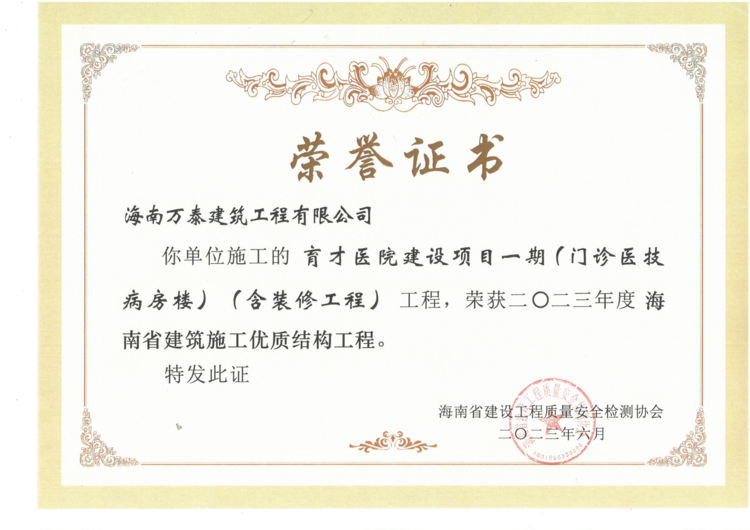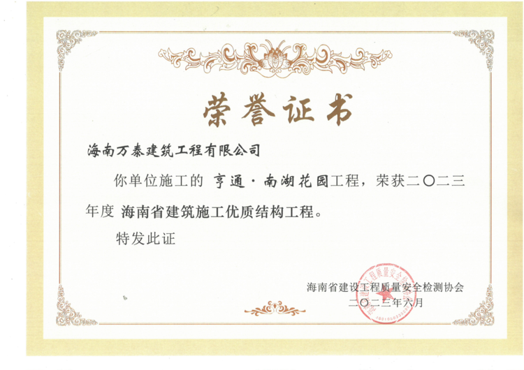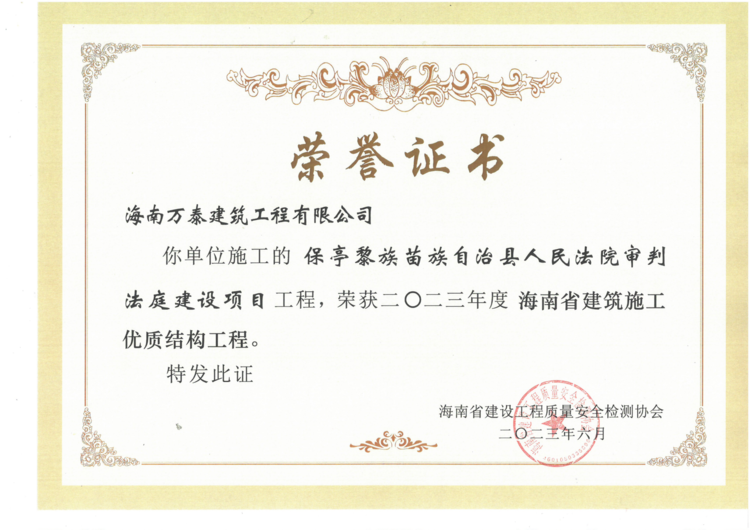近日,由公司承建的育才醫(yī)院建設(shè)項(xiàng)目一期、保亭黎族苗族自治縣人民法院審判法庭建設(shè)項(xiàng)目、亨通·南湖花園分別通過了海南省建設(shè)工程質(zhì)量安全檢測協(xié)會(huì)的評(píng)審,被評(píng)為“2023年度海南省建筑施工優(yōu)質(zhì)結(jié)構(gòu)工程”。該獎(jiǎng)項(xiàng)代表著全省建筑工程結(jié)構(gòu)施工質(zhì)量的領(lǐng)先水平,是精品工程的重要標(biāo)志。