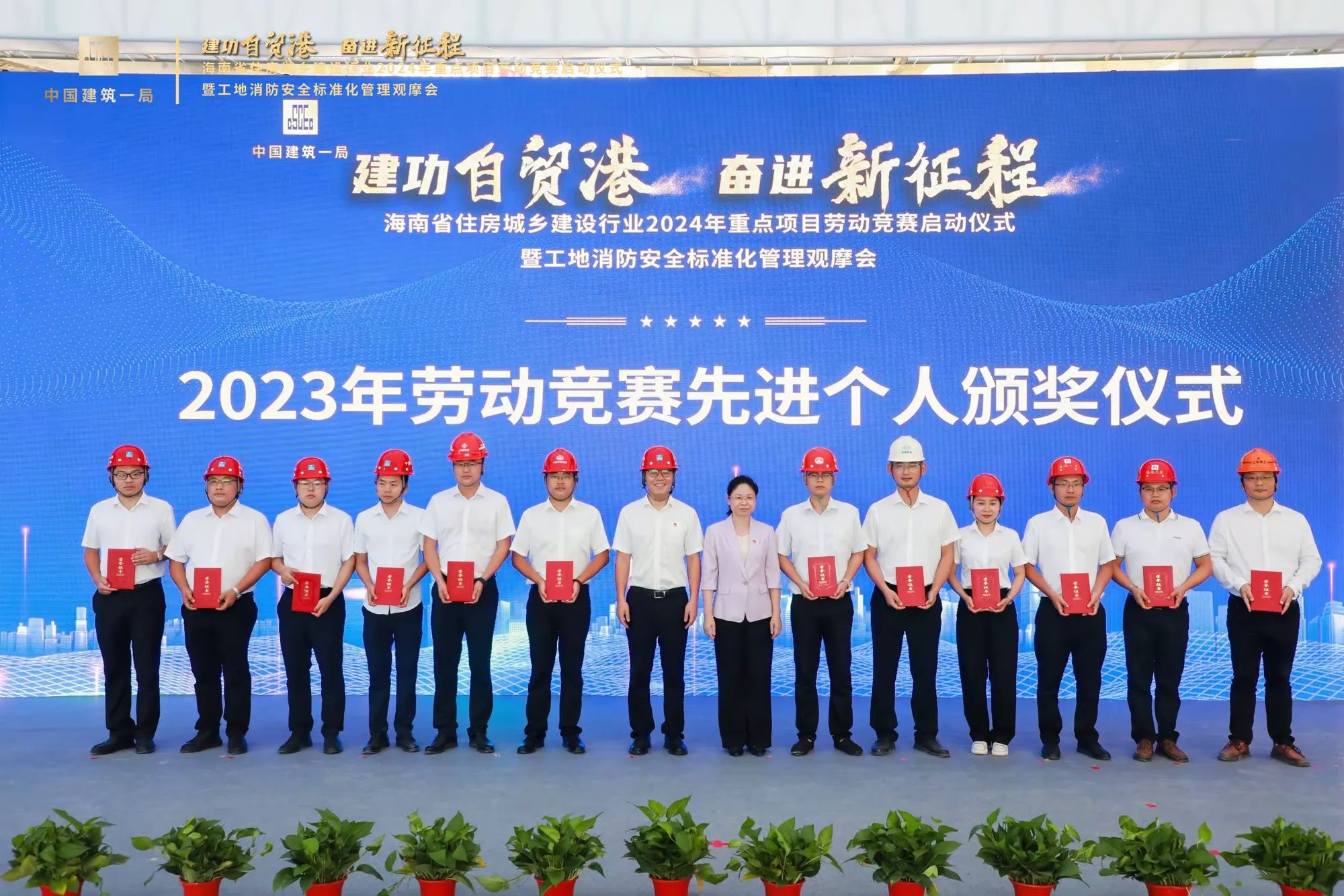 在啟動(dòng)儀式現(xiàn)場,公司林慧同志作為29名海南省住房城鄉(xiāng)建設(shè)行業(yè)2023年重點(diǎn)項(xiàng)目勞動(dòng)競賽“先進(jìn)個(gè)人”之一上臺(tái)領(lǐng)獎(jiǎng),張豪杰同志作為公司代表上臺(tái)進(jìn)行參賽單位宣誓。本次勞動(dòng)競賽以“七比一創(chuàng)”為主要內(nèi)容,即“比黨建引領(lǐng)、比工程進(jìn)度、比工程質(zhì)量、比安全生產(chǎn)、比科學(xué)管理、比技術(shù)創(chuàng)新、比文明施工、創(chuàng)優(yōu)質(zhì)工程”,進(jìn)一步激發(fā)廣大職工不斷提升自身能力水平,勇于奉獻(xiàn)、干事創(chuàng)業(yè)的熱情。