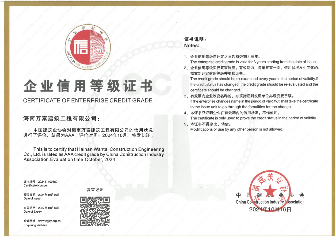 秋高氣爽,喜結碩果。近日,中國建筑業(yè)協(xié)會公布了2024年度中國建筑業(yè)AAA級信用企業(yè)名單。海南萬泰建筑工程有限公司榜上有名,成功獲評“ 2024年度中國建筑業(yè)AAA級信用企業(yè)”榮譽稱號!這是公司繼2021年首次獲評后再次獲評該稱號。