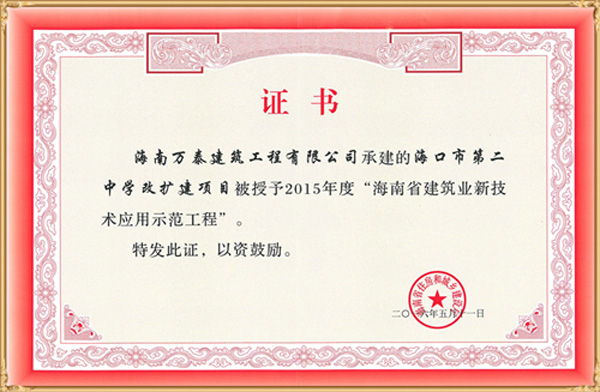 由海南萬(wàn)泰建筑工程有限公司承建的“海口市第二中學(xué)改擴(kuò)建項(xiàng)目”被海南省住房和城鄉(xiāng)建設(shè)廳授予2015年度“海南省建筑業(yè)新技術(shù)應(yīng)用示范工程”。